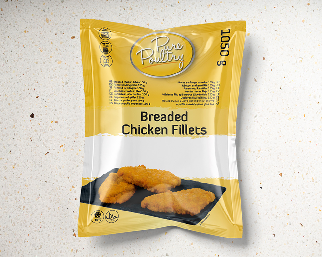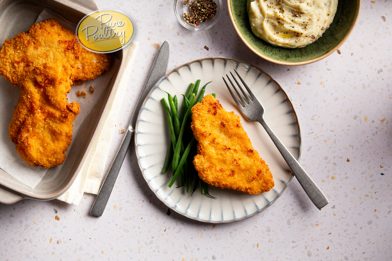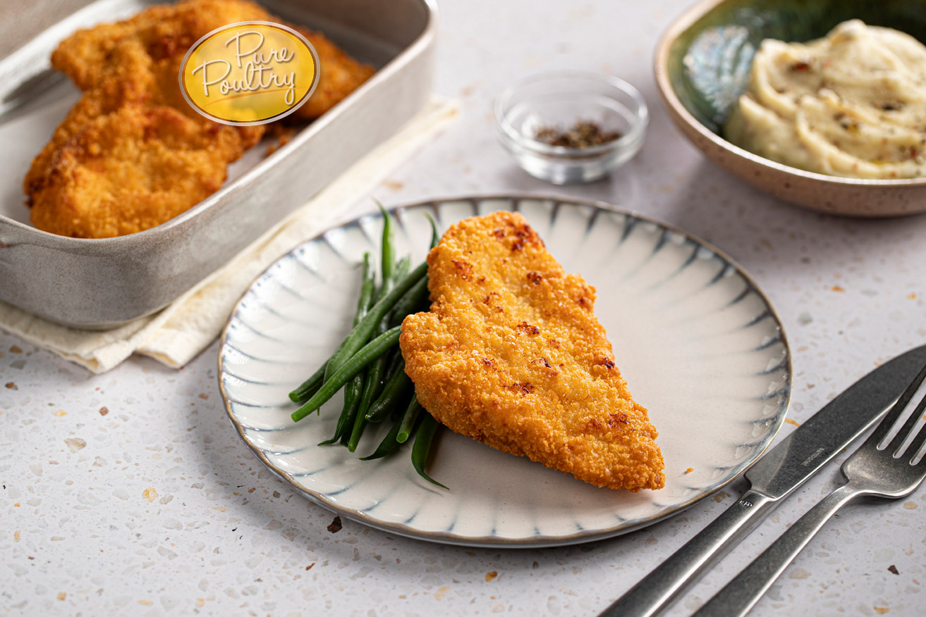Succulent chicken breast in a crispy golden breadcrumb. Used on a bun with some green salad and mayonnaise or as a meal component. Especially tasty with French fries and cooked vegetables.