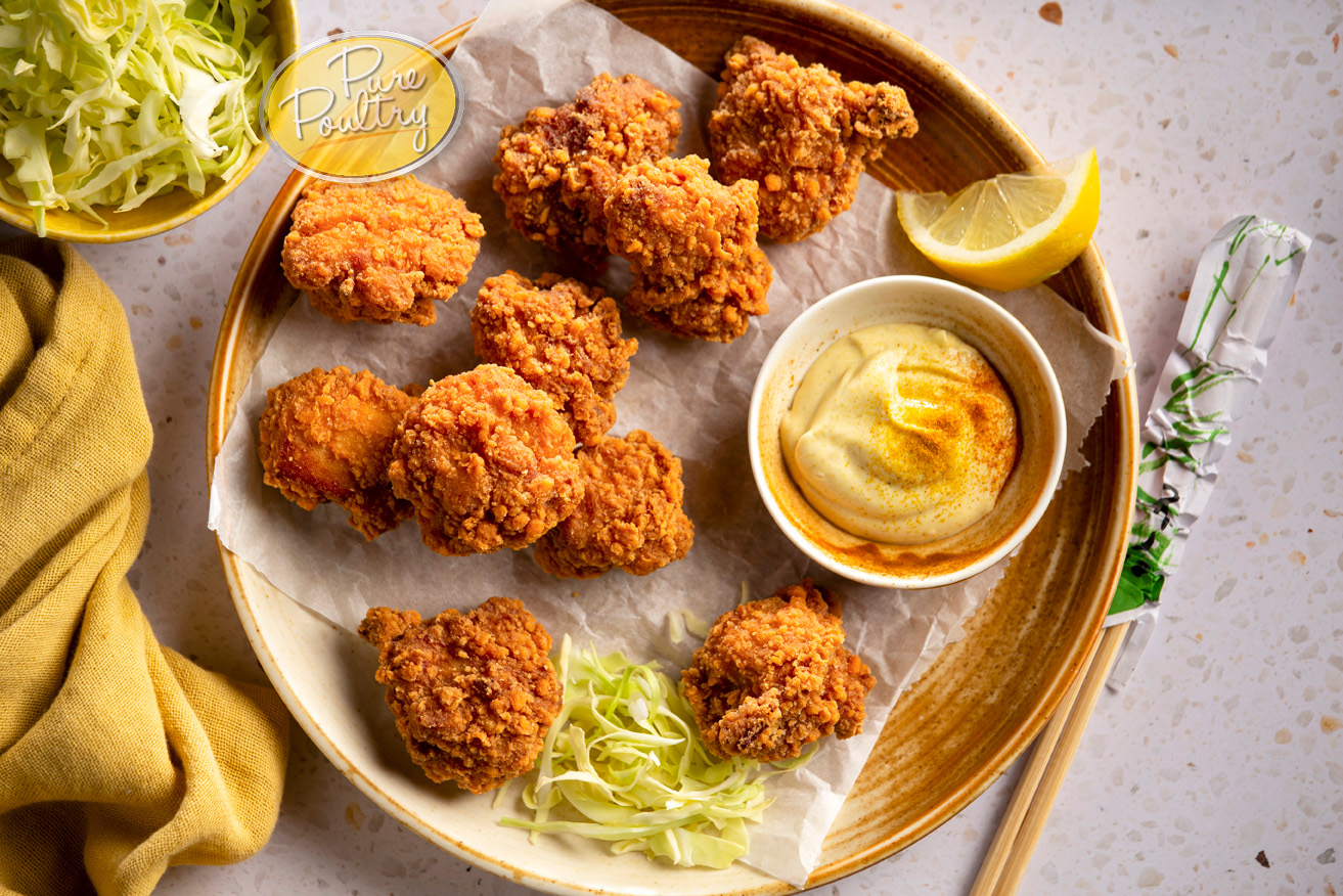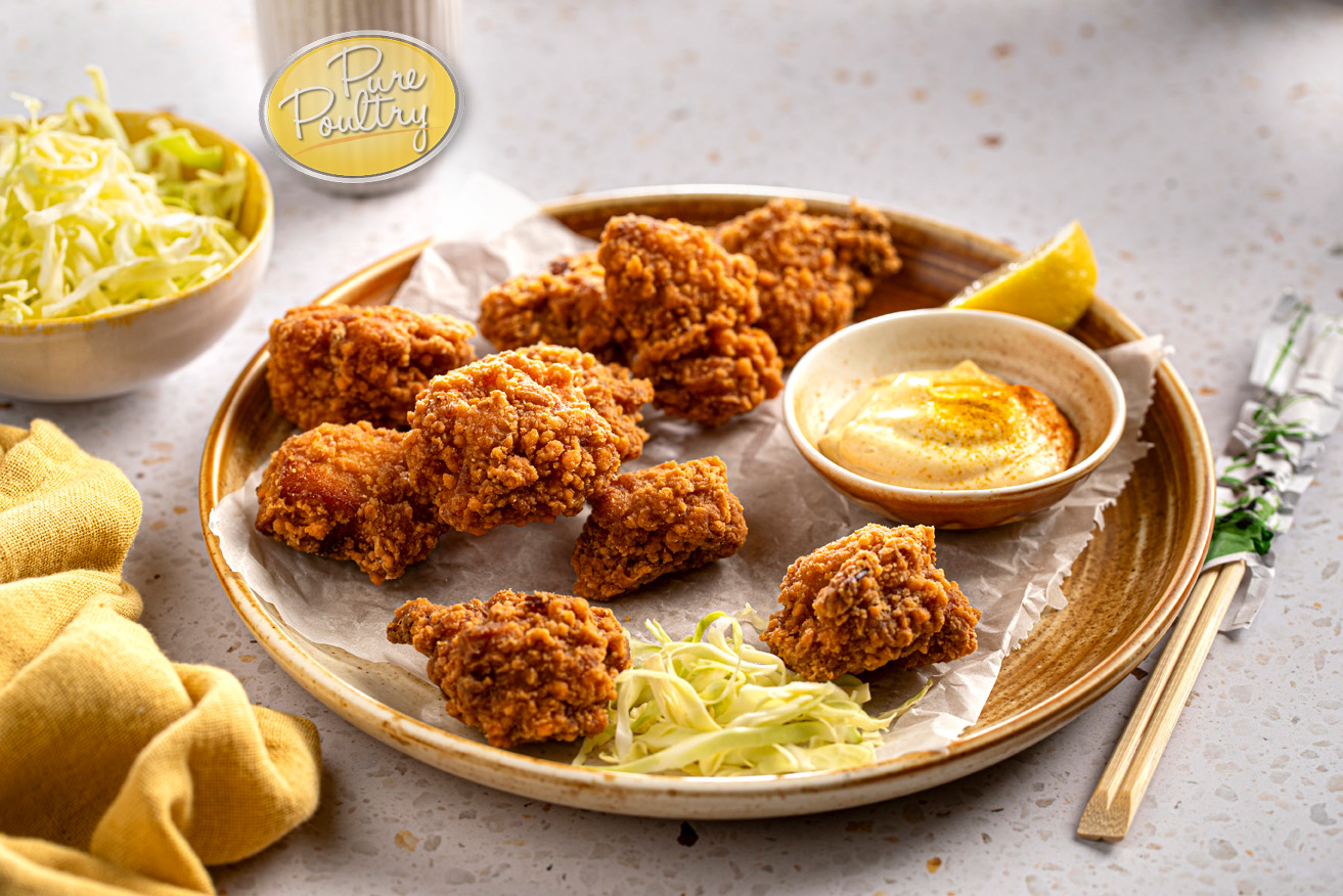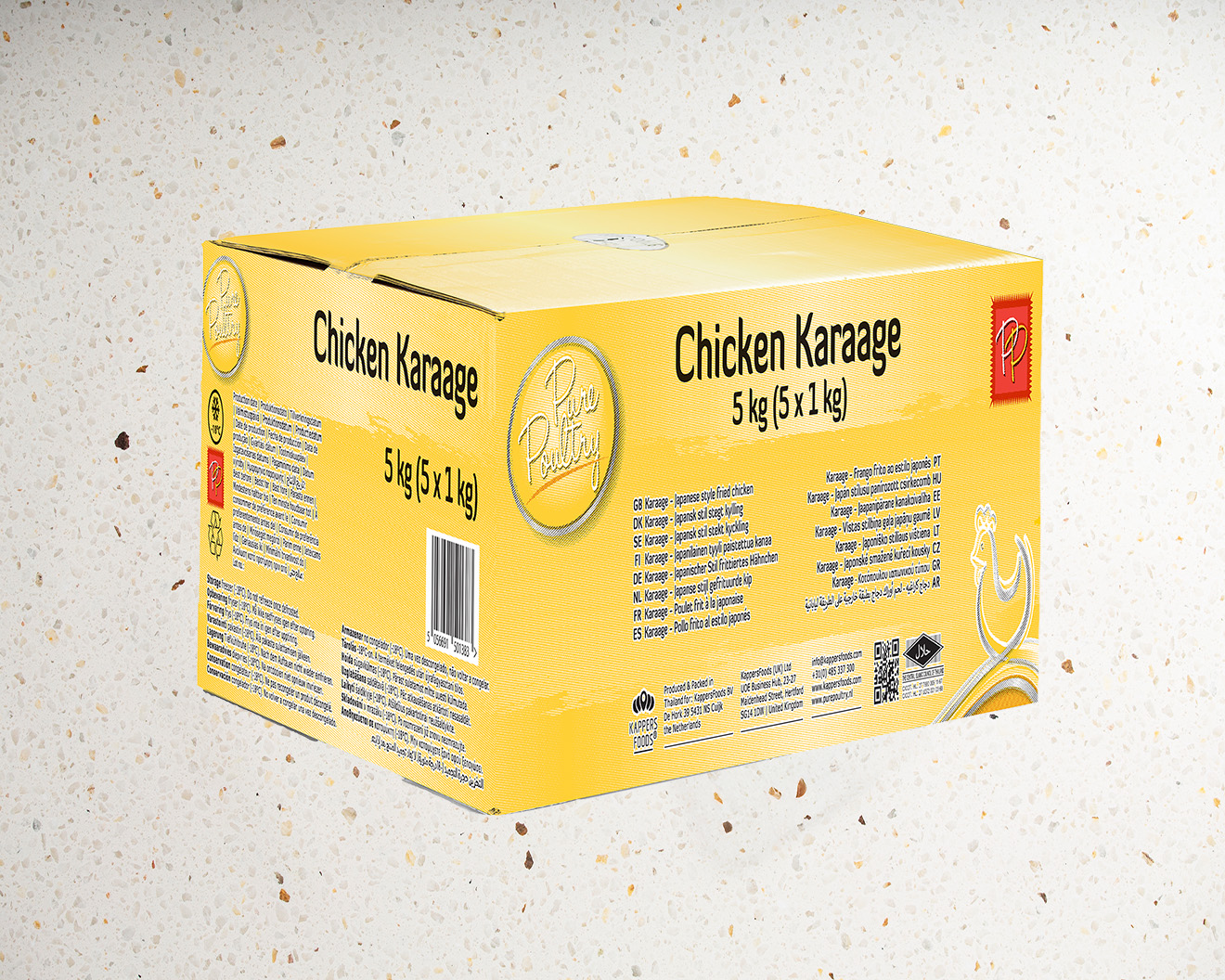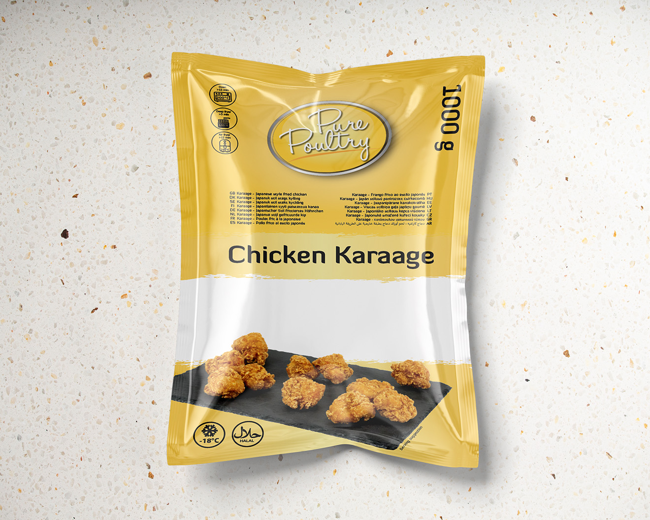 Chicken leg meat (60%), wheat flour, starch, fully refined soybean oil, soy sauce (soybean, wheat, salt), modified starch, ginger, starch, garlic, salt, raising agent (E500), white pepper, acidity regulator (E331, E500), thickener (E412), dextrose.