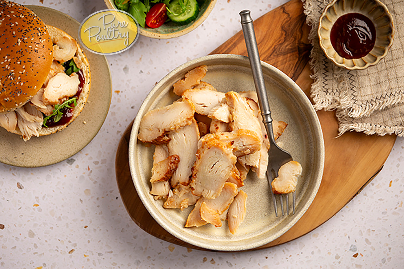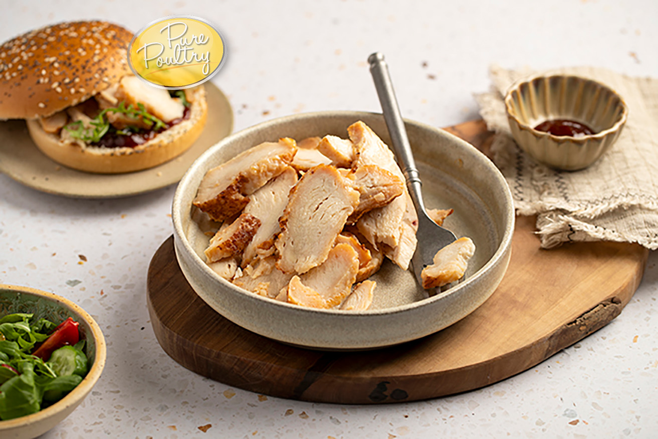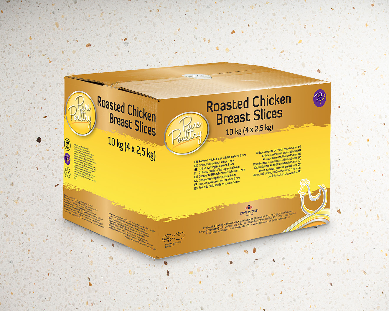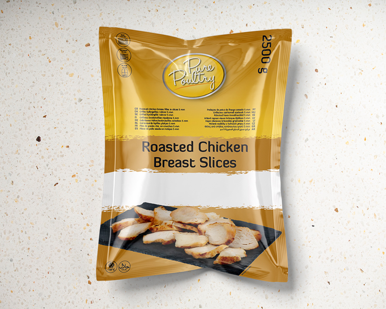 Delicious roasted chicken breast fillets cut into 5mm slices. After the slices are thawed they are ready to use in a wrap or on a sandwich, no heating required. Of course, the slices are also tasty on a hot pizza or in a grilled cheese sandwich.