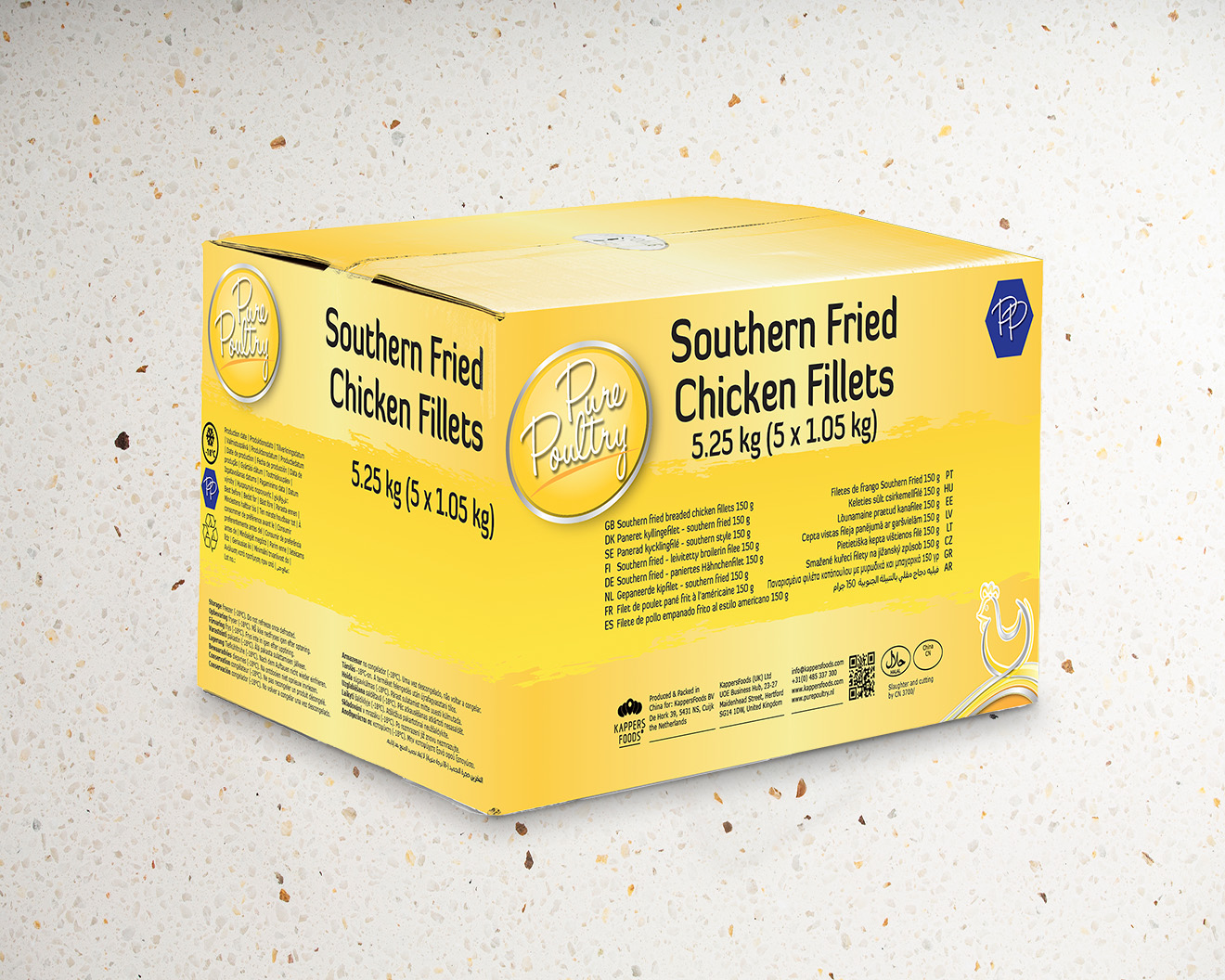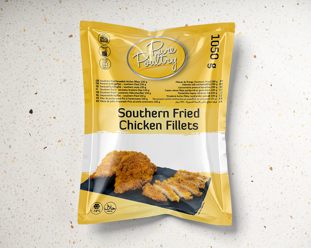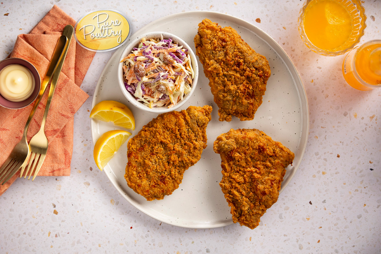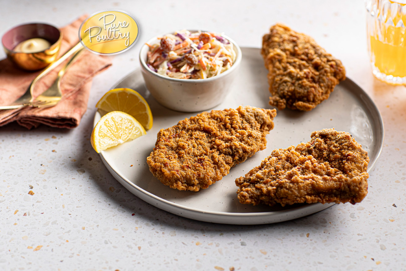 Succulent chicken breasts in crispy golden southern fried breadcrumbs. Nice and spicy. Used on a bun with some green salad and mayonnaise or as a meal component. Especially tasty with French fries and cooked vegetables.